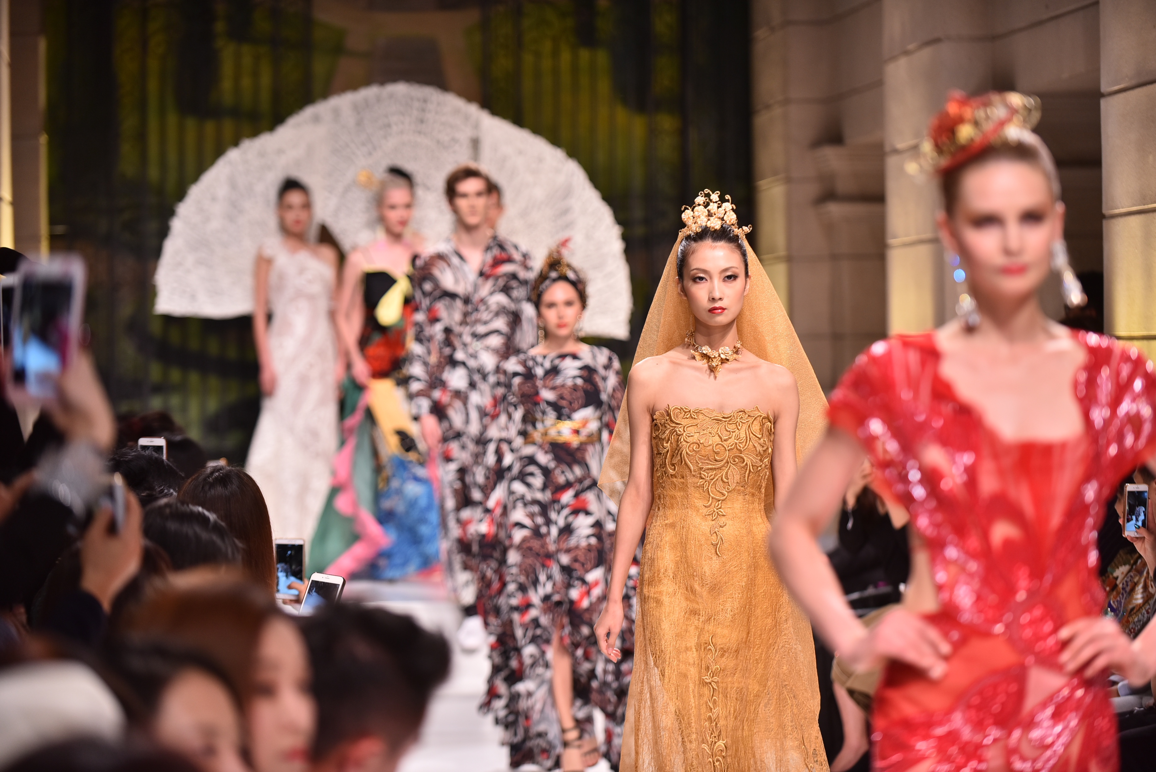 这次上海大秀中特别展出一件纯金丝线制成的礼服,桂由美介绍,这套礼服使用了82万米纯金线,织成的极为纤细的纯金面料,同时用纯金线刺绣了精美的图案,制作工艺令人惊叹。