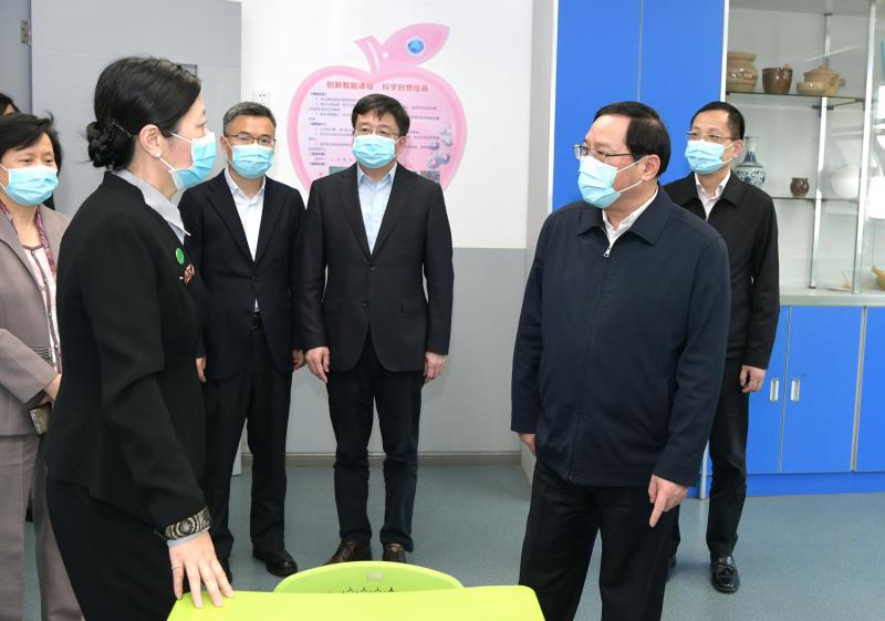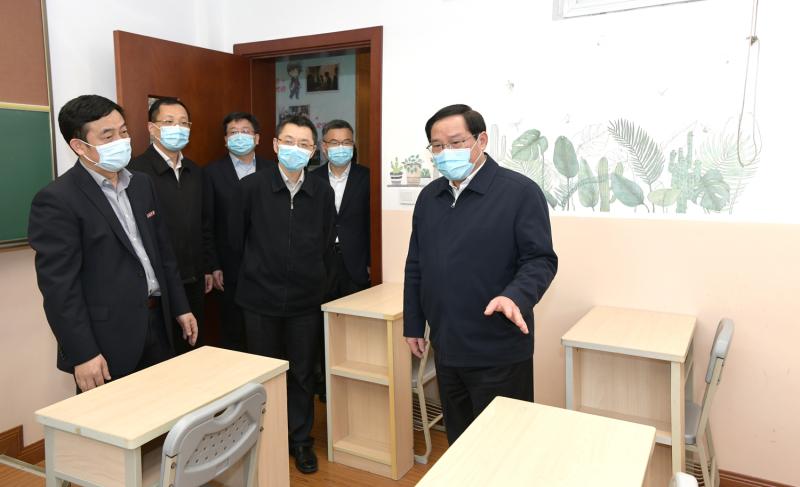 在上海师范大学第三附属实验学校,从入校检测区、留观区、防疫物资储备室到九年级教室、小学年级教室和食堂,市领导逐一察看询问校园防疫每个环节的流程安排、工作举措和应急预案,详细了解复学复课进展以及当前存在的困难和问题。根据复学安排,该校140余名九年级学生已全部返校上课。学校为师生配备防疫专用箱和健康包,定时做好环境清洁消杀,还制作了复学复工防疫小视频,全方位开展防疫知识宣传教育。李强说,学校疫情防控涉及多方面考验,不能有丝毫松懈麻痹,每一个环节、每一个流程都要周密考虑,细而又细、实而又实,真正做到想在前面、做在前端、快速反应,切实排查隐患、堵塞漏洞,全力守好校园安全。要统筹推进疫情防控和教学活动,加快完善学校应急管理体系,保证良好教学秩序和教育质量。