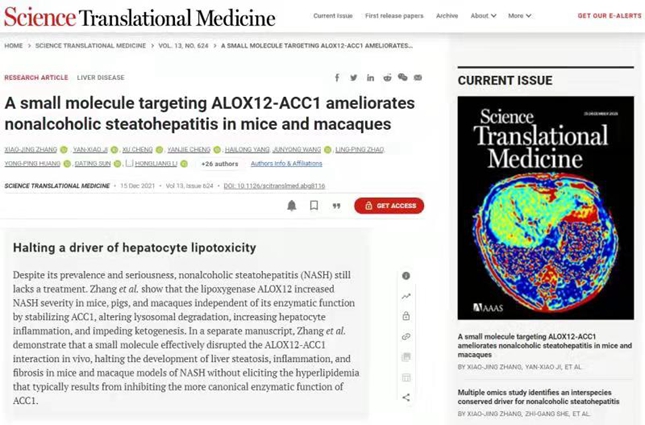 该杂志最新发表的来自中国学者的两篇论文,聚焦非酒精性脂肪肝的国际前沿研究,分别题为《多组学研究揭示非酒精性脂肪肝炎多物种间保守核心驱动因素》和《靶向ALOX12-ACC1的小分子化合物在小鼠和猕猴模型中改善非酒精性脂肪性肝炎》。研究成果突破了非酒精性脂肪肝治疗的国际研究瓶颈,解决了靶向治疗副作用这一重大难题。