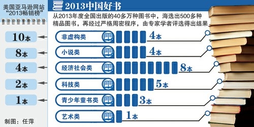 为了与海外阅读市场作一番对比,记者调查了美国亚马逊网站上的“2013畅销榜”排名前25本图书类别发现,其中非虚构类图书10本,小说类8本,经济社会类4本,科技类2本,青少年童书类1本。这与“2013中国好书”书单中非虚构类4本,小说类4本,经济社会类8本,科学类5本,青少年童书类3本,艺术类1本的构成相比,在结构上有着明显差异,最大的区别便是“2013中国好书”中经济类和科技类所占的比重远远超过同类图书在美国亚马逊网站销售榜中所占的比重。