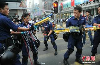 香港警方17日清晨开始在九龙旺角地区大规模清除“占领中环”人士设置的各种障碍物。警方清除障碍物后,弥敦道北行线恢复通车。