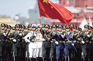 5月9日,莫斯科红场,斗志昂扬的中国人民解放军三军仪仗队高擎五星红旗,迈着铿锵步伐接受包括习近平主席在内的多国领导人和民众的检阅。