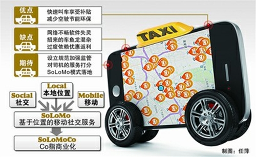 “腾讯和阿里加起来已经向出租车市场投了十多个亿,目前虽然还没有解决盈利问题,但达到了为新商业模式广而告之的目的。”张喆表示,这一轮“烧钱赚人气”过后,互联网企业将有可能“由点及面”,将移动支付推向更多日常生活领域,并在这个过程中探索解决盈利问题,将“SoLoMo”拓展为“SoLoMoCo”(co指商业化,commercial)。