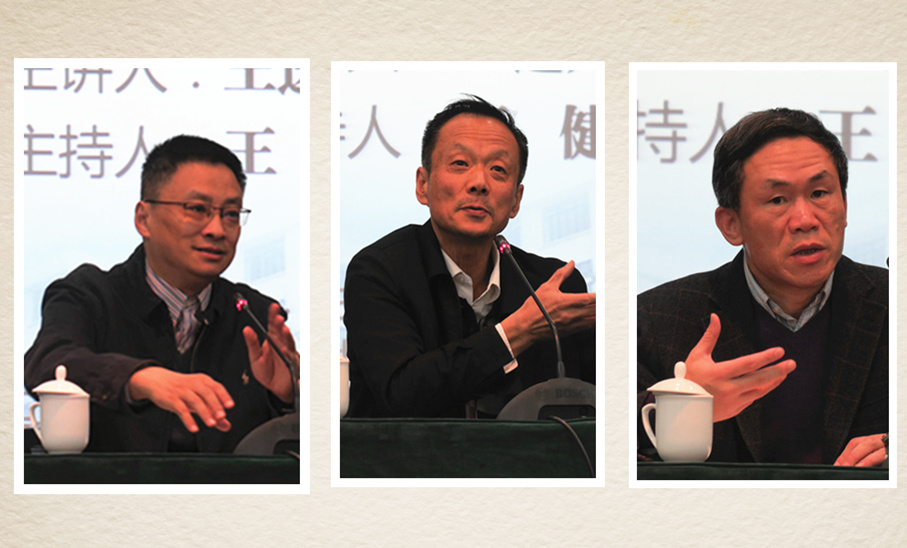 王健(上海社科院国际所所长,左一)担任主持,评议人刘鸣(上海社科院国际所研究员,中)、任晓(复旦大学中国外交研究中心主任,右)