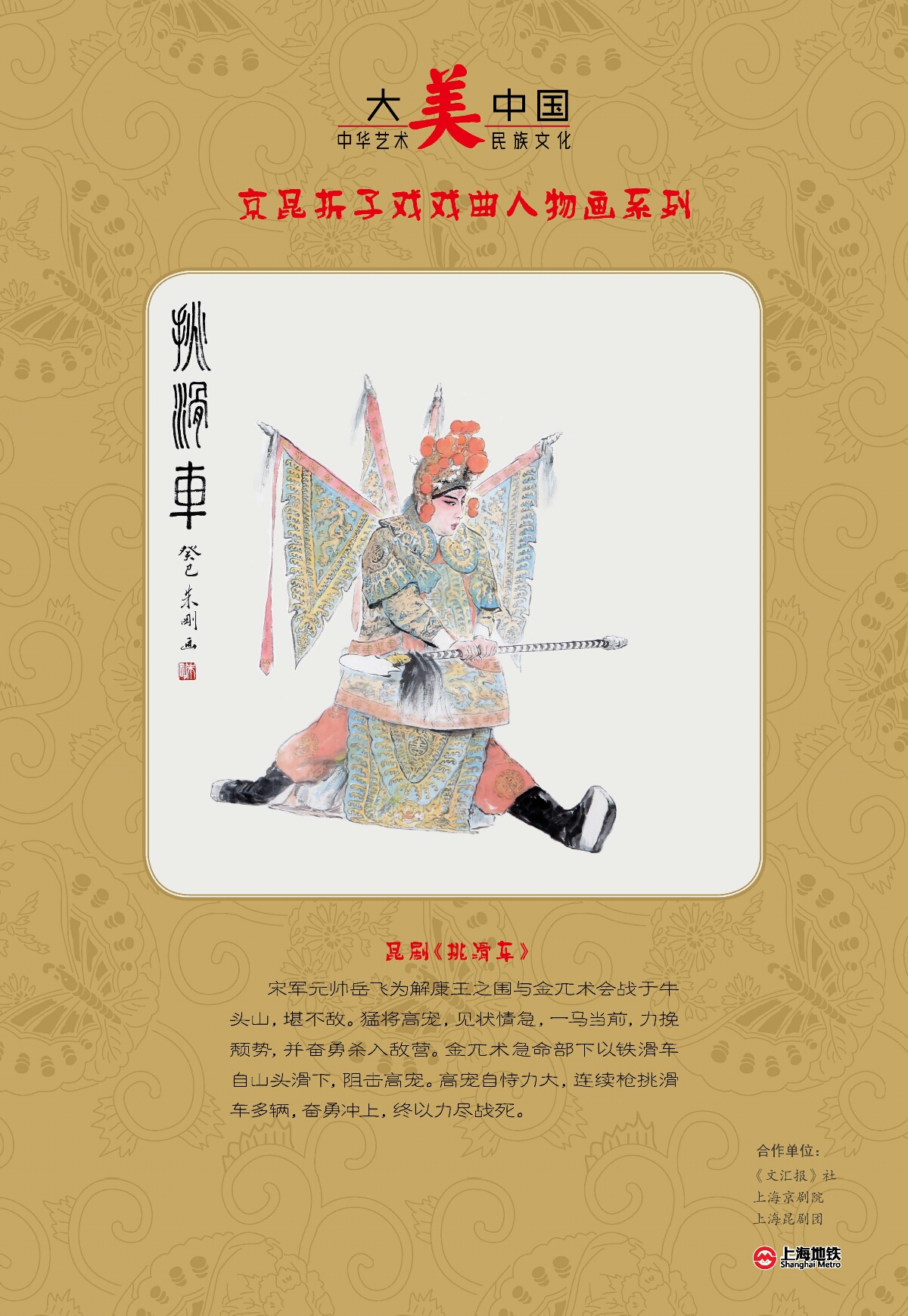 例如,市民在欣赏昆剧《挑滑车》的戏曲人物画时,不仅可以看到猛将高宠横抢跨步的英姿,还能在图画下方看到一小段配文,写有“宋军元帅岳飞为解康王之围与金兀术会战于牛头山,堪不敌。猛将高宠,见状情急,一马当前,力挽颓势,并奋勇杀入敌营。金兀术急命部下以铁滑车自山头滑下,阻击高宠。高宠自恃力大,连续枪挑滑车多辆,奋勇冲上,终因力尽战死。”
