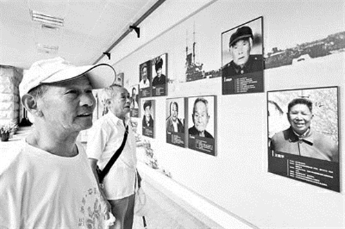 两位老人特意赶来参观淞沪抗战纪念馆的战士照片故事墙。本报记者 陈龙摄