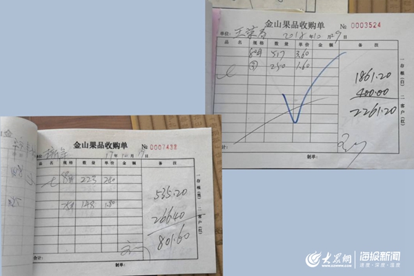 王寿光特意翻出了之前的交易账本,大众网·海报新闻记者看到,以市场通常作为标杆的直径80毫米苹果来说,2017年收获的苹果,当时刚上市时每斤的交易价格是2.4元。而2018年收获的苹果,种植户卖出的价格是每斤3元到4元。