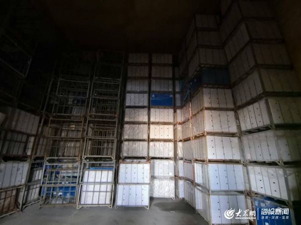 顺着王寿光的的指引,记者来到了位于栖霞市金山店子村的金盛保鲜库。据说,金盛保鲜库的宫国志去年在自己的冷库里存了大量的苹果,今年赚了不少钱。在金盛保鲜库的院子里,大众网·海报新闻记者见到了大量冷库里盛放苹果的空架子。而和当地其他冷库基本上都已经清空不同,金盛保鲜库仍有三个“洞”紧闭库门。显然,就算是在苹果出库价格连创历史新高的5月份,宫国志还存有大量的苹果没有出库。宫国志让工作人员打开了其中一个库门,刺骨的寒气扑面而来,就算室外气温高达32度,记者仍然忍不住打了个寒战。顺着浓郁的苹果香味,记者看到,整整一个冷库的苹果,堆放的高度接近十米。看着眼前堆积如山的苹果,宫国志的喜悦之情溢于言表。