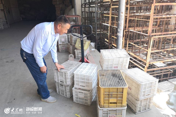 6月12日上午,由于刚刚出库一车苹果,宫国志正在整理刚刚被清空的苹果箱。