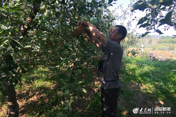 6月12日下午,大众网·海报新闻记者驱车来到栖霞市松山街道河南夼村,在一个池塘边的果园里,见到了正在给苹果“套袋”的王国晓夫妻俩。