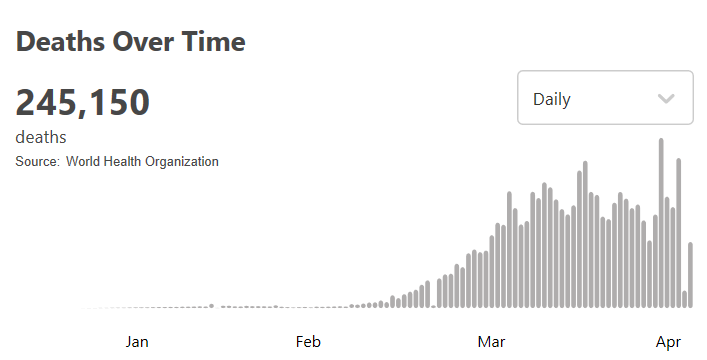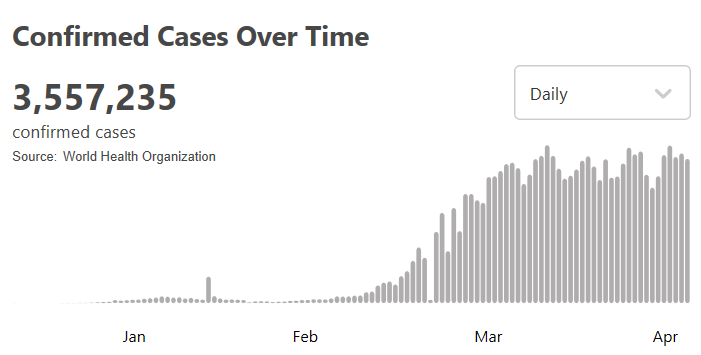 根据世卫组织最新实时统计数据,目前全球确诊新冠肺炎病例3557235例,死亡245150例,中国以外超过347万例。