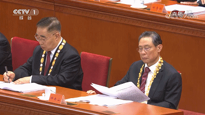 △钟南山、张伯礼、张定宇、陈薇就座主席台上。