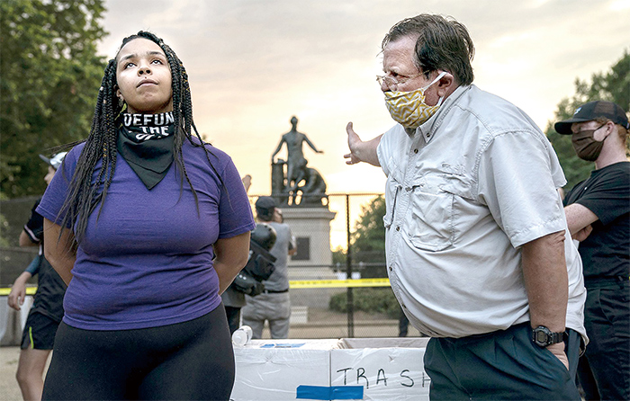 2020年6月25日,美国华盛顿特区林肯公园,26岁的Anais(左)与一名男子辩论身后林肯解放碑的去留问题。Anais主张移除该纪念碑,而男子主张留下。 伊芙琳·霍克斯坦 摄