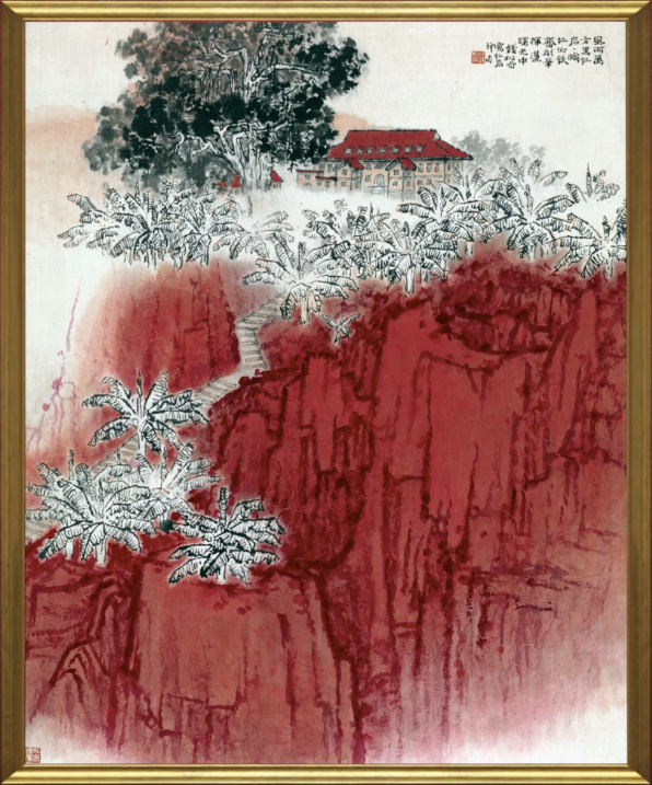 于是他开始做调整,把黄桷树比例缩小,把芭蕉用白描简单勾勒,采用大面积使用朱砂这种大红色的效果来表现红岩村所蕴含的革命精神,深化红色革命的主题。