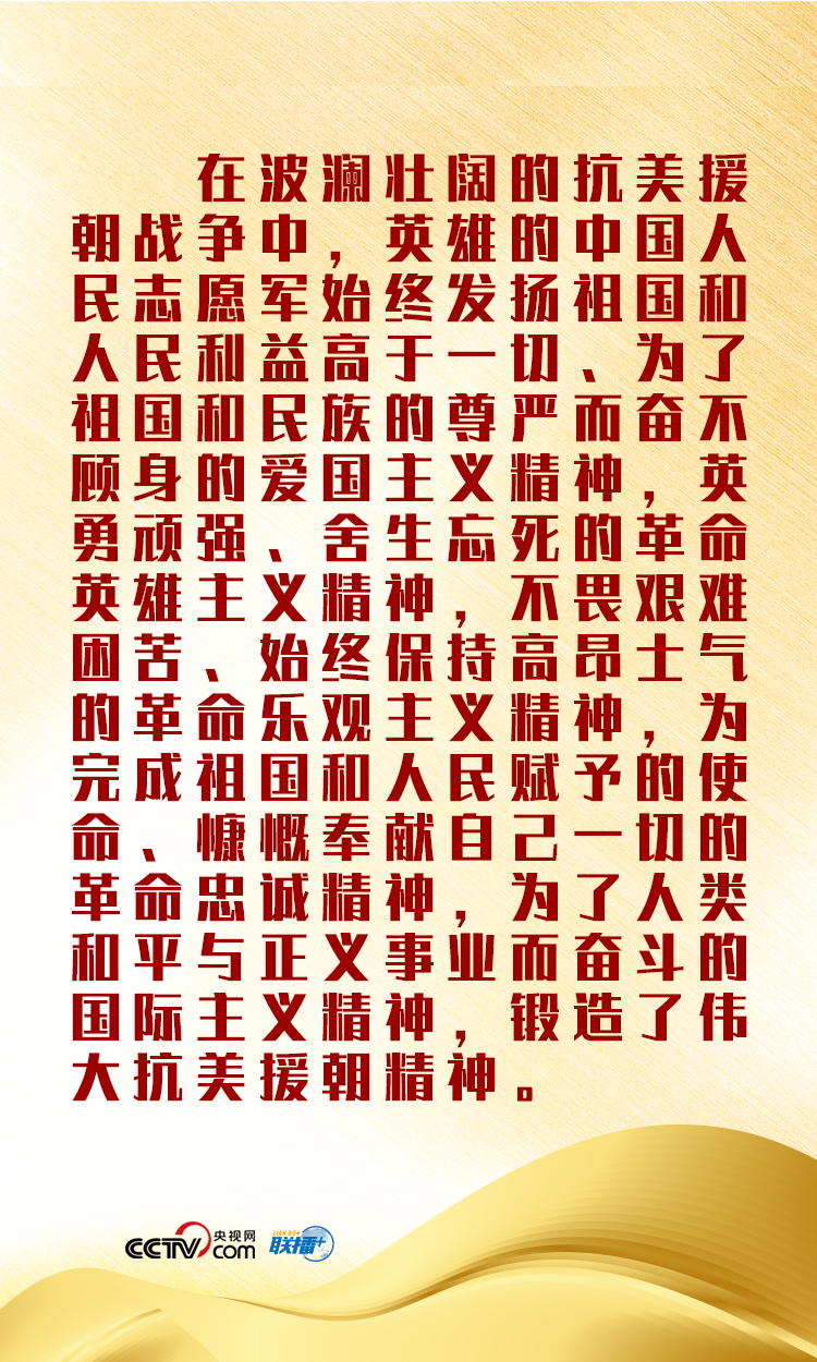 “抗美援朝战争伟大胜利,是中国人民站起来后屹立于世界东方的宣言书,是中华民族走向伟大复兴的重要里程碑,对中国和世界都有着重大而深远的意义。”