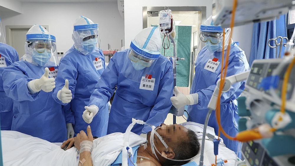 5月8日,武汉协和医院医务人员向新冠肺炎患者成功撤除ECMO表示祝贺。新华社发