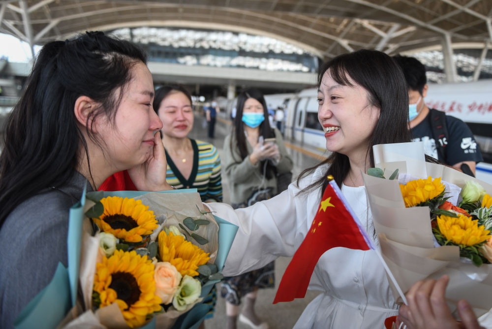 10月1日,一批驰援过武汉抗疫的江苏医疗队队员重回武汉,曾经并肩战斗的江苏援鄂医疗队员吴卫娟(右)和武汉市江夏中医院的董璇(左)再度相逢,喜极而泣。新华社记者 程敏 摄