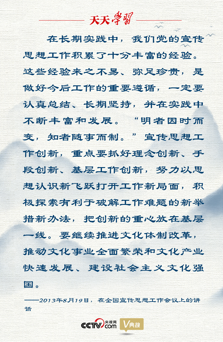 宣传思想工作必须与时俱进。2013年8月19日,习近平总书记在全国宣传思想工作会议上特别引用了“明者因时而变,知者随事而制”这句古语,强调创新在宣传思想工作中的重要性。他强调重点要抓好理念创新、手段创新、基层工作创新,努力以思想认识新飞跃打开工作新局面,积极探索有利于破解工作难题的新举措新办法,把创新的重心放在基层一线。