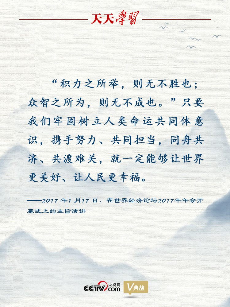 2017年1月17日,世界经济论坛2017年年会在瑞士达沃斯开幕。国家主席习近平出席开幕式并发表题为《共担时代责任 共促全球发展》的主旨演讲,强调要坚定不移推进经济全球化,牢固树立人类命运共同体意识,共同担当,同舟共济,共促全球发展。第二天,在联合国日内瓦总部,习近平主席又发表题为《共同构建人类命运共同体》的主旨演讲,深刻、全面、系统阐述人类命运共同体理念。4年来,人类命运共同体理念及其深刻的实践意义从达沃斯传出,在世界范围内回响。这是藉由中国智慧提出的中国主张、发出的中国声音,展现了我国在复杂多变的国际形势下积极参与全球治理的大国担当。