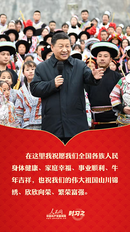中华民族传统节日农历牛年春节即将到来之际,习近平先后来到贵州毕节、贵阳等地,深入农村、社区、超市等考察调研,看望慰问各族干部群众,向全国各族人民、向港澳台同胞和海外侨胞致以美好的新春祝福。人民网·中国共产党新闻网“时习之”栏目制作了九张金句海报,一起来看!
