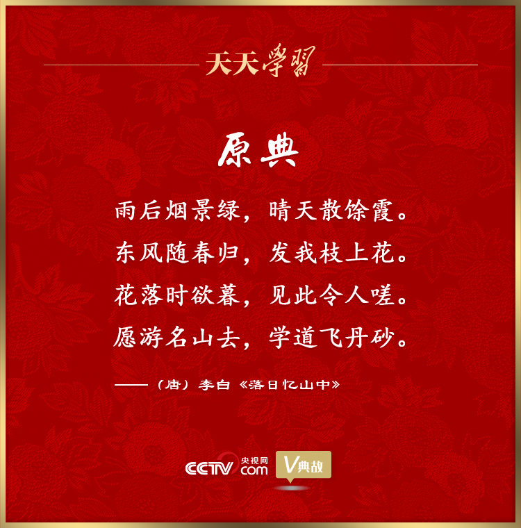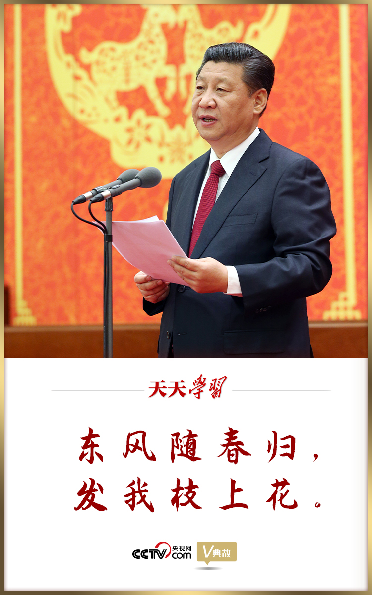在2015年春节团拜会上的讲话中,习近平总书记开场便引用了李白的“东风随春归,发我枝上花”,为我们展现了一幅亮丽动人的春景图,一股意气风发的豪迈之气油然而生。春华今正浓,秋实自可期。“春天播种,秋天收获。让我们踏着春天的脚步,把人民对美好生活的向往作为奋斗目标,扎扎实实干好各项工作,共同创造祖国的美好未来。”在讲话结尾,习近平总书记发出了动员令,宣示了党中央团结带领人民创造新辉煌的坚定信心,也表达了全体中华儿女奔向伟大梦想的共同期盼!