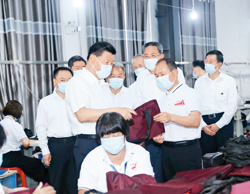 2020年8月18日至21日,中共中央总书记、国家主席、中央军委主席习近平在安徽省考察。这是18日下午,习近平在阜阳市阜南县红亮箱包有限公司察看车间生产线,了解企业灾后恢复生产和受灾群众、贫困群众就业情况。 新华社记者 鞠鹏/摄