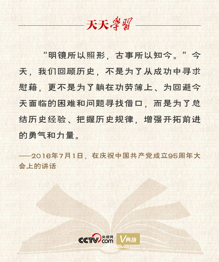 在“七一”重要讲话中,习近平总书记一语道出了以历史为镜鉴的目的和意义:“我们回顾历史,不是为了从成功中寻求慰藉,更不是为了躺在功劳簿上、为回避今天面临的困难和问题寻找借口,而是为了总结历史经验、把握历史规律,增强开拓前进的勇气和力量。”