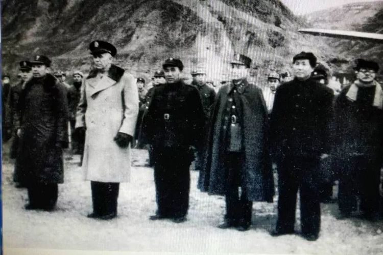 ▲1946年3月4日下午军事三人小组到达延安,受到中共中央负责人和数千群众的欢迎。左起:周恩来、马歇尔、朱德、张治中、毛泽东、林伯渠