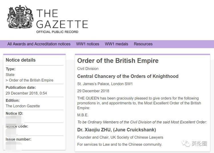 2018年底,英国政府公布新一年度的荣誉榜,共1148人入选,有三名华裔以其贡献上榜,朱小久是其中唯一来自中国大陆的获勋者,获得大英帝国员佐勋章MBE。