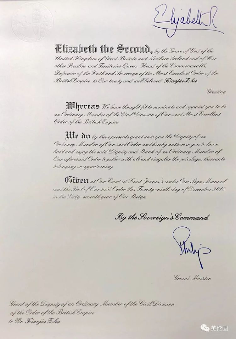 这一次,无关出身背景,朱小久用自己的专业和奉献获得了自己专属的勋章。4月4日,身穿传统中式旗袍的朱小久在白金汉宫亲自从查尔斯王子手中接过英国女王授予的大英帝国员佐勋章MBE。