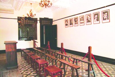 如今,纪念馆一楼是根据当年召开成立大会时的场景复原的展厅,天花板和地砖都是当年的,并依据资料摆放了黑板、讲台、长凳。在教室后面的墙上,挂着鲁迅、钱杏邨、夏衍、冯乃超、田汉、洪灵菲、郑伯奇这7位左联第一届常委的肖像。在二楼展示厅,摆放着不少当年盟员如茅盾、丁玲等人用过的器物。