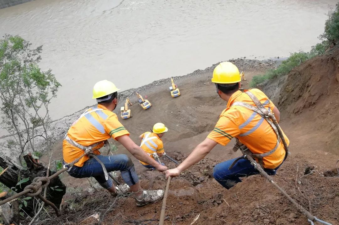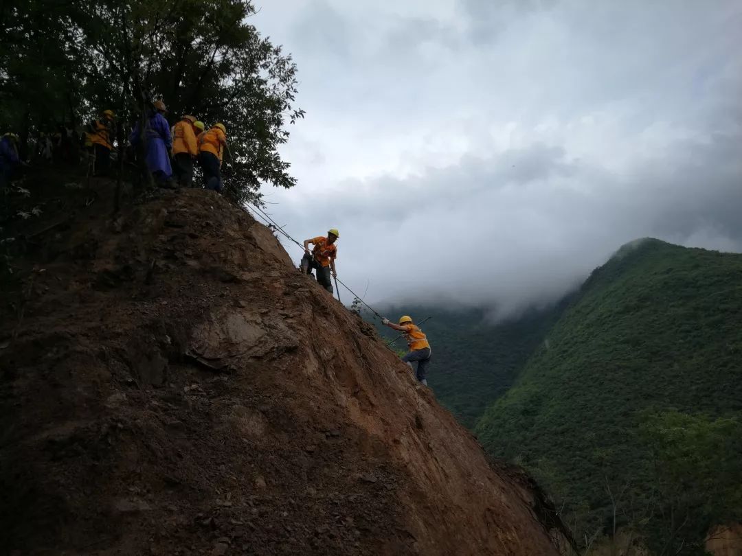 没有上山的路,抢险人员要背着土镐和撬棍,抓着安全绳、系着安全带登到150米高、坡度近乎90度的山顶,身体悬空像蜘蛛人一样,从上向下清理危石和悬空的树根桩。