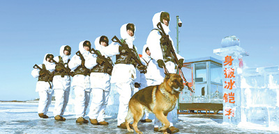 1月31日,北部战区陆军某边防旅“黑河好八连”官兵在界江“5号哨位”的冰哨前执勤。 |
