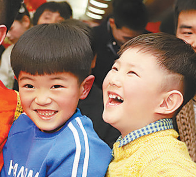 2月1日,在南昌开往北京西的直达列车上,小旅客被“列车春晚”逗乐。 |
