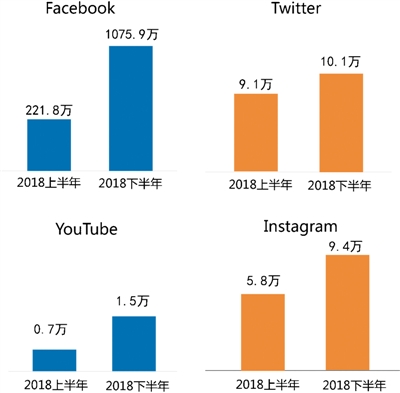 2018年以来,尤其是6月份以后,央企及其子公司新开通了几十个境外社交媒体账号。受此影响,与2018年上半年相比,Facebook平台中央企业集团账号的总粉丝量增长最迅猛,增长率高达385.2%,增长量为850余万。其次,YouTube平台央企集团账号的总粉丝量增长率也非常可观,为101.2%,增长量为7523个;与上半年相比,Instagram平台央企集团账号的粉丝量增长62.0%,增长了3.6余万;Twitter平台央企集团账号总粉丝量增长率为10.7%,粉丝量比上半年增长近万个。(见图4)