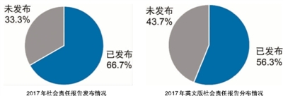 《报告》对中央企业发布的2017年社会责任报告进行了统计。研究显示,截至2018年底,64家中央企业发布了《2017年企业社会责任报告》。其中36家中央企业发布的报告采用中文和英文两种语言,占已发布报告中央企业数量的56.3%,报告的国际化程度不断提高。中国移动通信集团有限公司、中国海洋石油集团有限公司、中国石油天然气集团有限公司等32家中央企业在社会责任报告中专门设置了“海外社会责任”等专题。分析发现,部分中央企业突破传统的文字形式,运用视频等多媒体形式展现其社会责任建设情况,达到良好的传播效果。(见图5、表2)