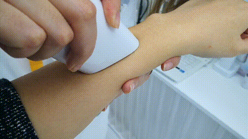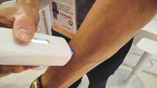 现场,工作人员在产品发明家的手臂上试了一下,原本布满斑点的手臂,瞬间变得光洁无暇。